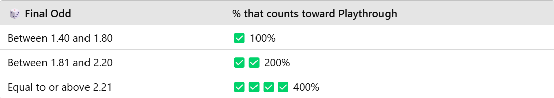 For sports betting, the amount that contributes to the Playthrough depends on the final odd of your bet (single or multiple):