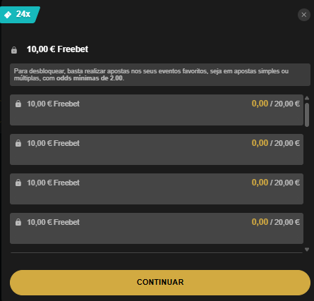 As Freebets associadas à oferta de 1º Depósito não são atribuídas automaticamente – vão sendo desbloqueadas progressivamente consoante cumpre os requisitos da promoção.